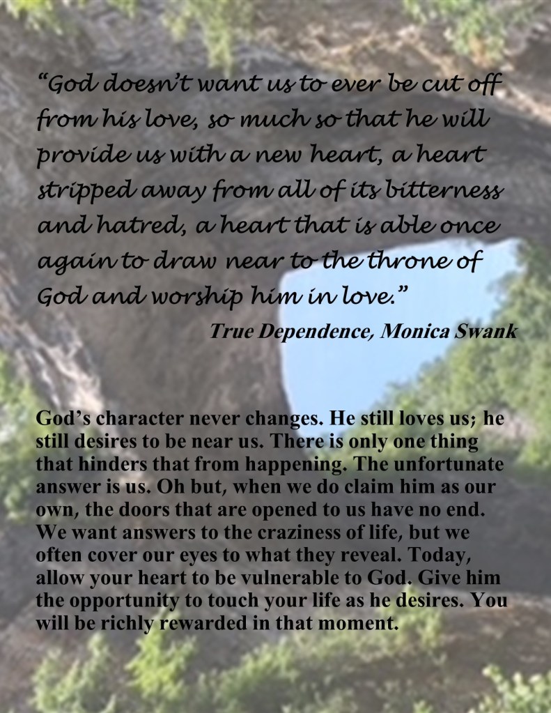 When we look at the forest, we should not be consumed by its vastness, but rather treasure that which we will find when we journey through it. We are much the same way as a forest, twisted and tangled. It is when you learn how to move beyond those places that you will find the strength in the lesson. God will always be a presence in these knotted places if you allow him to journey with you. Find courage today as you travel, that beauty can be found in the chaos.