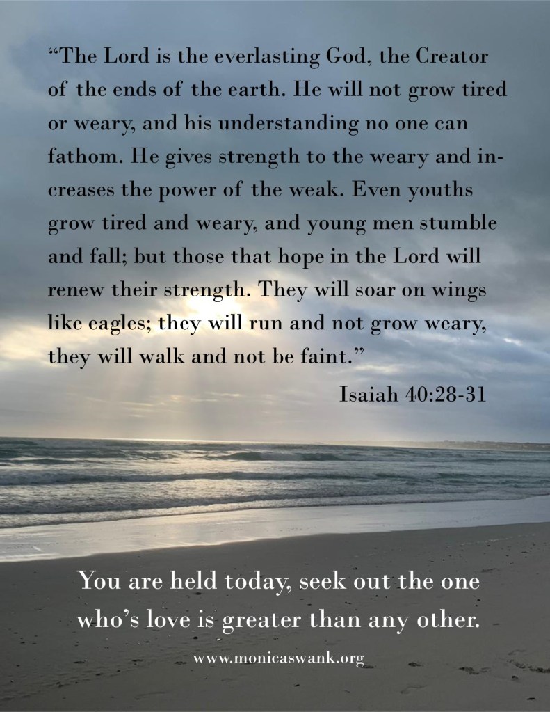 Like a small child rests safely within the arms of a loving parent, so to we are offered this type of rest. From the world we can fall into the arms of a faithful God, into peace. Today, release your troubles, inhale a deep breath, and trust in your heart that you are cared for by a loving and gracious God.